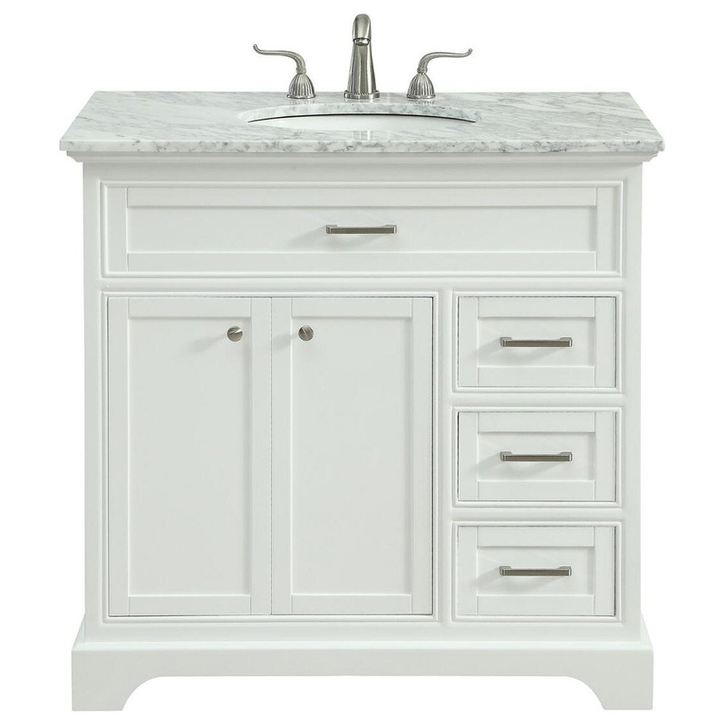 From its Italian Carrara white marble top to its contemporary-styled hand painted white cabinet, this member of our Americana vanity collection is sure to enhance either your home or office bathroom. Beneath its lustrous, natural marble top and an oval, white porcelain under mount sink, is a cabinet with 3 handsome drawers and 2 doors with a single shelf for all your bathroom essentials, highlighted with recessed panel doors, brushed steel bar handle and knobs, stands on strong solid pedestal feet. A wonderful balance of simplicity and practical function! Measurements: W36 xD21.5 xH35Available at AppliancesConnection Features: Features Italian Carrara marble top oval white porcelain under mount sink Made of Solid wood and MDF contemporary-styled hand painted white cabinet Includes one shelf Faucet is not included fully assembled