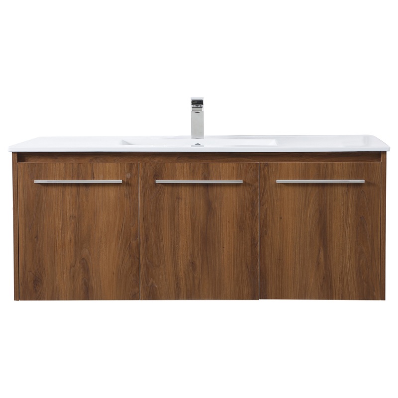 Elegant Decor VF44048WB 48 inch Single Bathroom Floating Vanity in Walnut BrownThe contemporary simplicity of this 48″ floating vanity in a walnut brown finish will help open the space and add stunning modern flair to your bathroom or powder room. The open space below makes it easy to show off your tiles and to clean the floor with ease–it’s also the perfect place for a hamper. 3 doors open to reveal plentiful of storage pace to store all of your bathroom miscellany. The clean lines that permeate through the design will surely create a fresh look in your home.Style: ModernCollection: RasinaFinish Color: WalnutBrownHardware Finish: Brushed NickelFixture Material: MDF, porcelain, metalProduct Shape: RectangleHardware Material: steelDimension(In): 18.31(W) x 19.69(H) x 48(L)Lighting Canopy: YesCabinet Base Material: MDFBase Finish: Walnut BrownCountertop Included: YESCountertop Material: PorcelainCountertop Finish: WhiteCountertop Dimension: 18.31(W) x 0.79(H) x 48(L)Sink Material: PorcelainSink Dimension(In): 20.08(W) x 7(H) x 10.63(L)Sink Mouting Type: IntegratedVanity Mouting Type: Wall-hung/floatingBacksplash Included?: noVanity Wood Type: MDFVanity Top Material: PorcelainDoor Included: YESNumber Of Doors: 3Cabinet Interior Dimension(In): DR1: 30.35