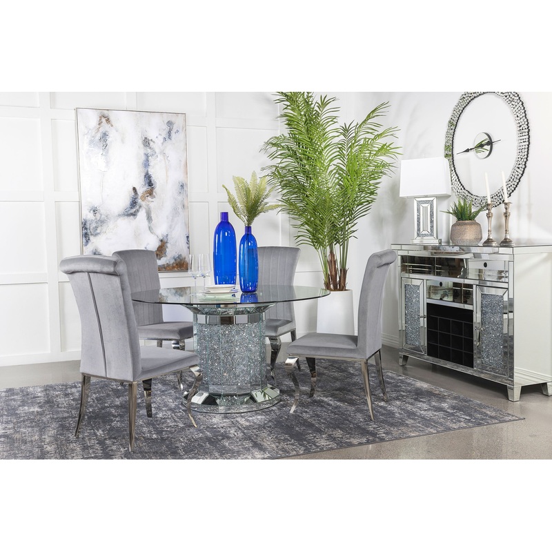 Invite over a few guests to celebrate at this modern glam dining table. A round, clear glass top reveals the scintillating column-inspired pedestal frame beneath, offering an open and airy look. Sparkling faux diamonds are encrusted within the base for a luxe touch. Defining the flush bottom base and the top is a gleaming mirror tile trim that reflects its surroundings effortlessly. Slide up each of the four velvet upholstered side chairs and enjoy a restful dining experience with their tall backrests and rolled tops.