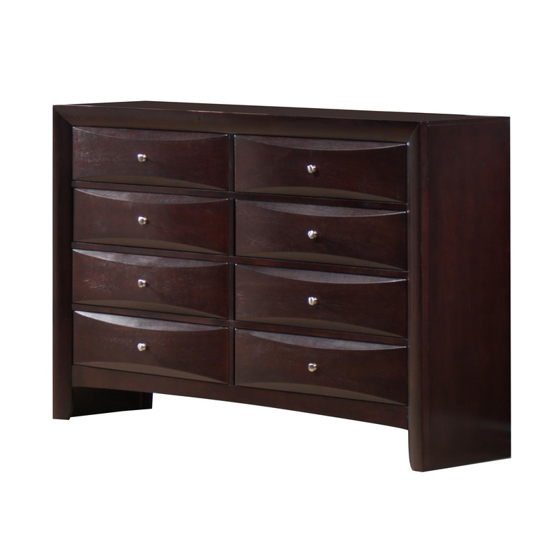 The Emily Dresser is the perfect addition to your bedroom! This dresser comes with eight spacious drawers perfect for neatly storing away all your belongings. A dust proofing layer on the bottom drawers help protect your belongings. Silver finish metal knobs pair beautifully with the dark, rich finish, making this case piece a staple in your home for years to come.