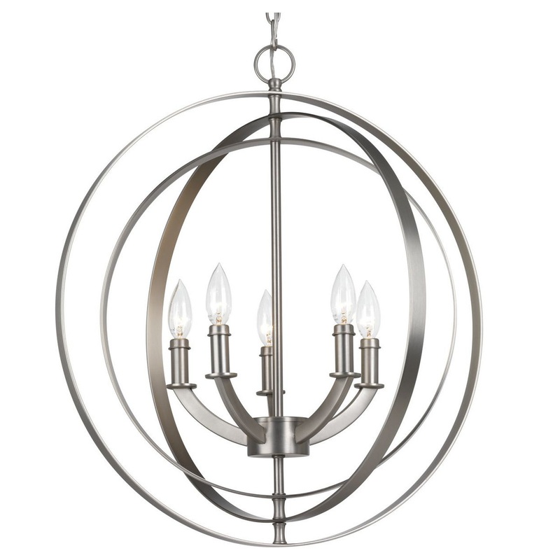 Inspired by ancient astronomy armillary spheres, the interlocking rings pivot for an infinite variety of positions. Five-light chandelier pendant in Burnished Silver is ideal for installations over a farmhouse table, dining room setting or kitchen island. Can be used individually or in groupings of two or more.