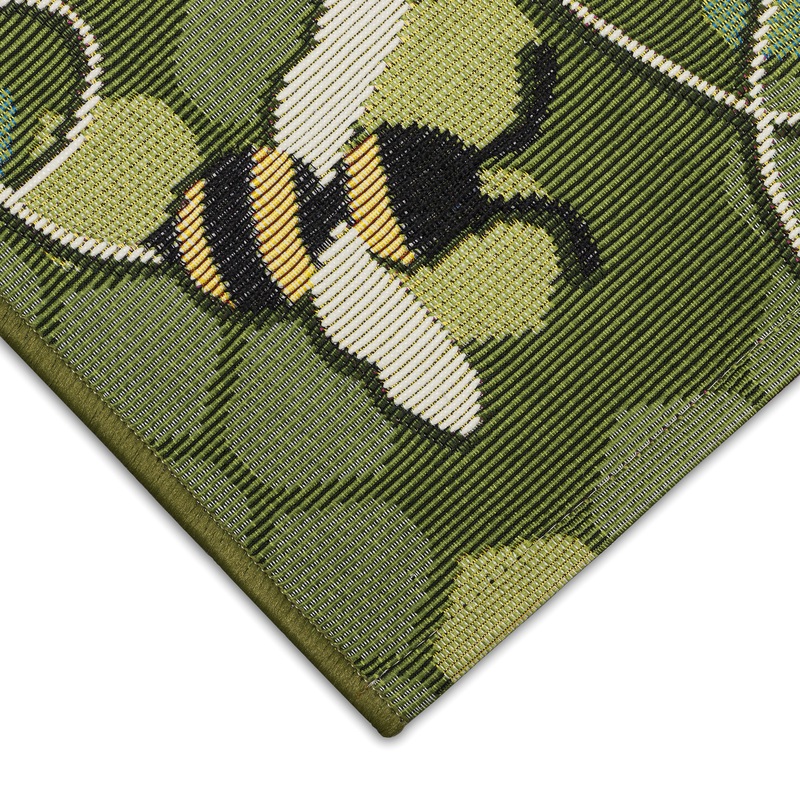 Busy black and yellow bees buzzing around on a multi shade green mosaic background. Made in Egypt from 75% polypropylene/25% polyester, reinforced with a latex non-skid backing, the Esencia Collection is Power Loomed to create intricate designs with a broad color spectrum and a high-quality finish. The material is flatwoven, low profile, weather resistant, UV stabilized for enhanced fade resistance, durable and ideal for those high traffic areas such as your patio, sunroom, kitchen, entryway, hallway, living room and bedroom making this the ideal indoor or outdoor rug. Detailed patterns are offered in an eclectic mix of styles ranging from tropical, coastal, geometric, contemporary and traditional designs; making these perfect accent rugs for your home. Limiting exposure to rain, moisture and direct sun will prolong rug life.