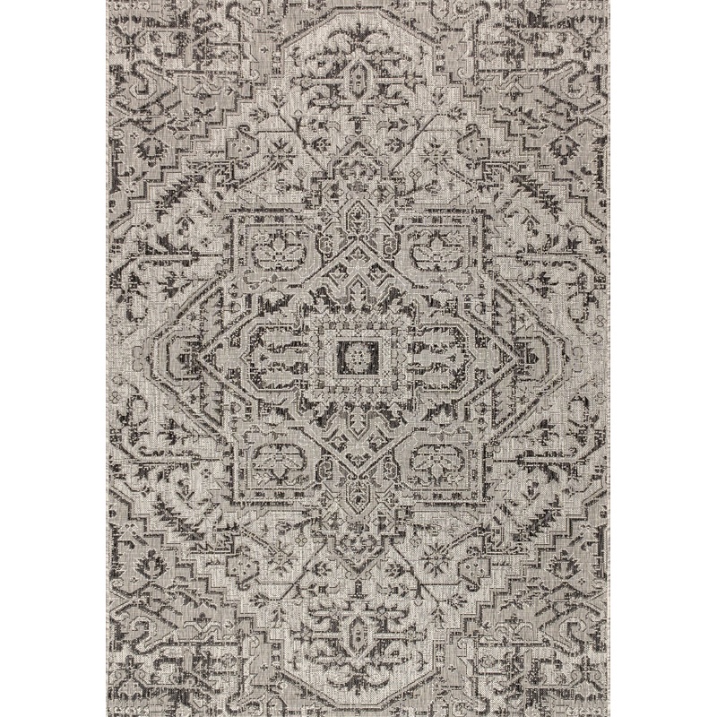 With its star-inspired medallion, this borderless rug adds dreamy Bohemian style to an outdoor porch or patio. Varied tones of black on a mingled gray background give this rug a hand-woven, vintage vibe. The flatweave design is great for high-traffic spaces indoors too.