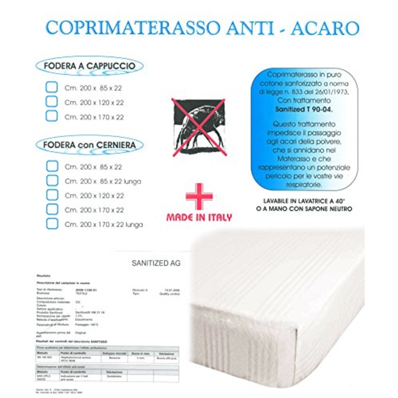 Dettagli: Coprimaterasso per letto matrimoniale, con fodera a cappuccio, in puro cotone damascato sanforizzato a norma di legge n 833 del 26/01/1973, Con trattamento Sanitized T 90-04, questo trattamento impedisce il passaggio agli acari della polvere, che si annidano nel materasso e che rappresentano un potenziale paricoloso per le vostre vie respiratorie. lavabile in lavatrice a 40 o a mano con sapone neutro. misura 200 x 170 x 22