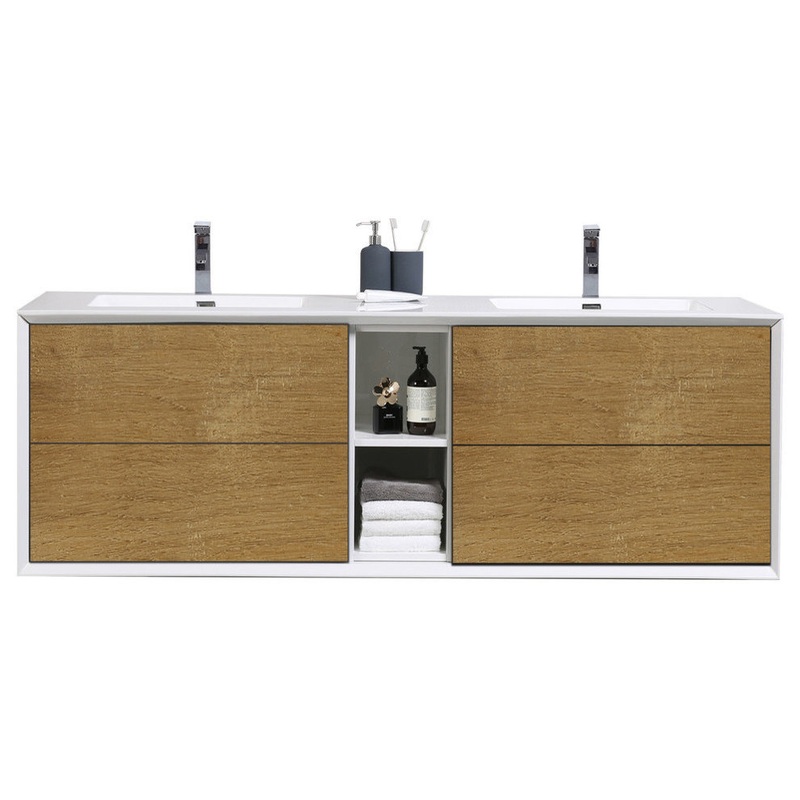 The Eviva Vienna vanity makes a bold statement with its modern look. The exclusion of hardware allows the countertop to blend well with the cabinet basin giving it a classy yet minimalist look. Wall mount installation keeps the Vienna suspended above your