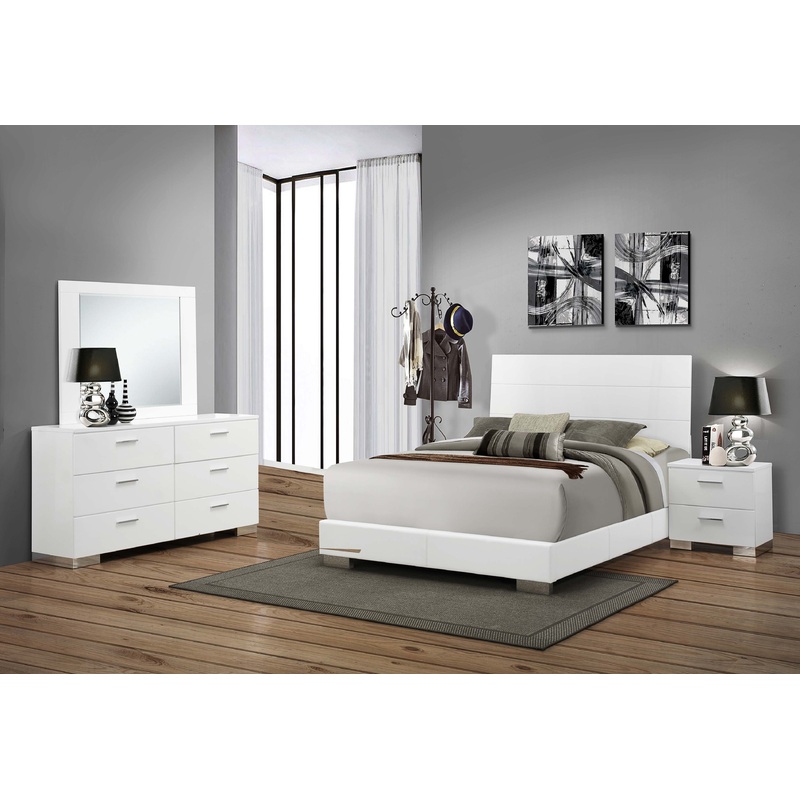 Elevate your bedroom with the sleek sophistication of this contemporary bedroom set. The panel bed features a clean-lined white high gloss headboard and a faux leather upholstered frame, delivering a refined yet modern aesthetic. Chrome-finished accents add a polished touch, while smooth-gliding drawers ensure effortless functionality. Designed for both style and durability, this set brings a fresh, minimalist feel to any space.