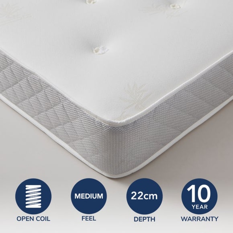 Tufted TopOpen CoiledHypoallergenicMedium SupportSuitable for all SleepersCrafted with care, this mattress features an open coil construction, providing robust support and ensuring a restful night's sleep. The bamboo-infused fabric cover offers natural ant
