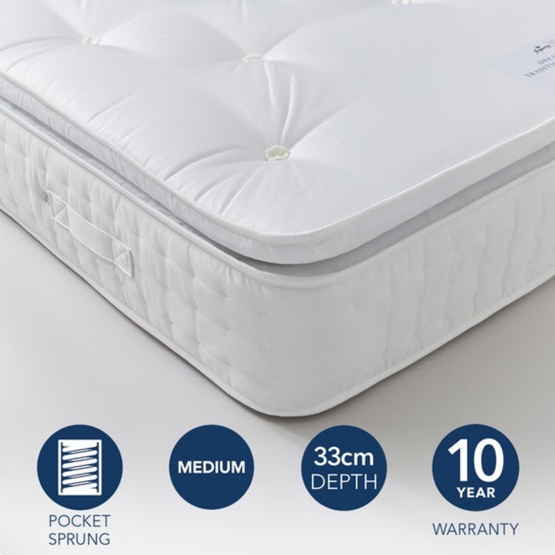1000 Pocket SprungPillow Top for added comfortMedium Support ideal for side and front sleepersEco-polyester Filling made from recycled polyester fibresHand Tufted holds filling in place for consistent supportQuilted Boarder with Wire Frame edge-to-edge sup