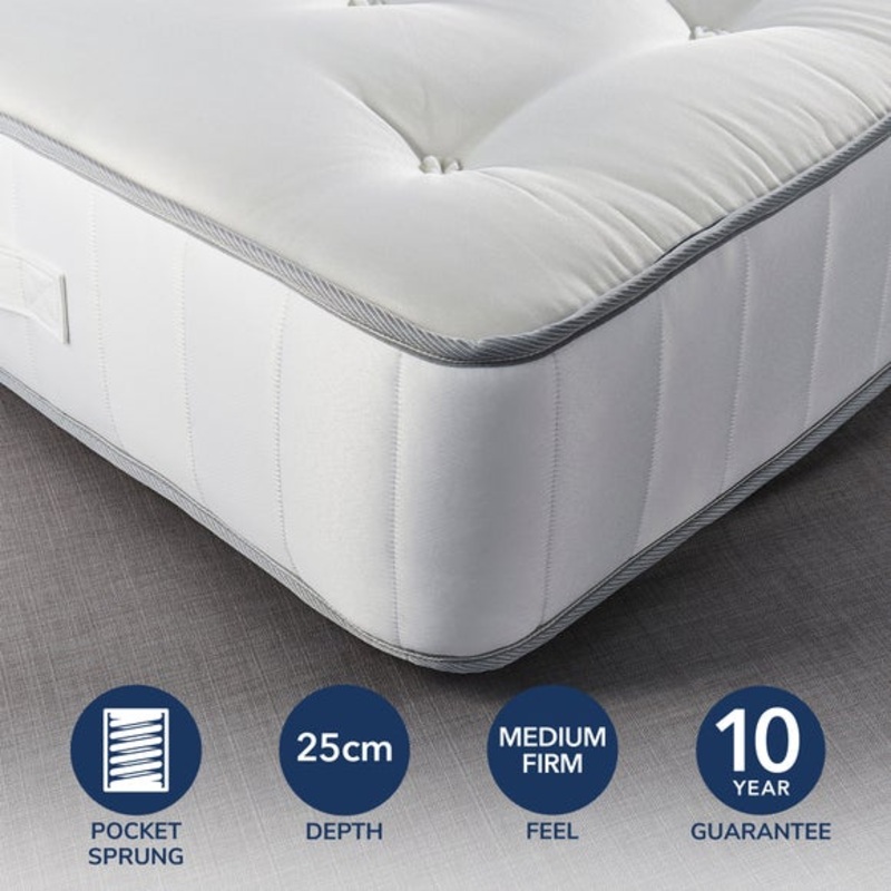 1500 Pocket SprungMedium Firm Support ideal for front and back sleepersWool Filling natural temperature regulatorEco Flex Filling protective and comforting recycled textiles layerHand Tufted holds filling in place for consistent supportQuilted Boarder with