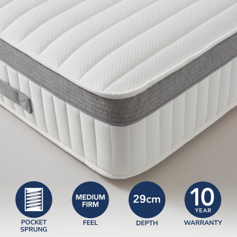 25mm Memory Top1000 Pocket SpringsHypoallergenicMedium to Firm SupportSuitable for all SleepersCrafted with care, this mattress incorporates recycled materials. The memory foam top offers unparalleled comfort and support, moulding to your body's contours f