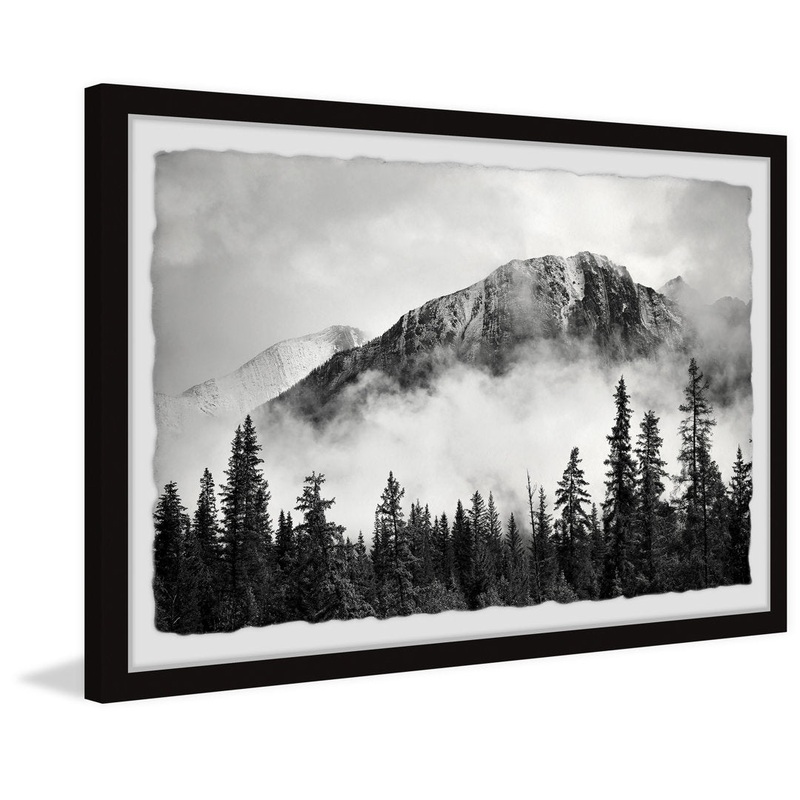 This black and white photographic print features a foggy mountain that towers over a lush forest. This piece is printed on high-quality archive paper and professionally hand-framed. With wall-mounting hooks included, this artful accent is ready to hang up