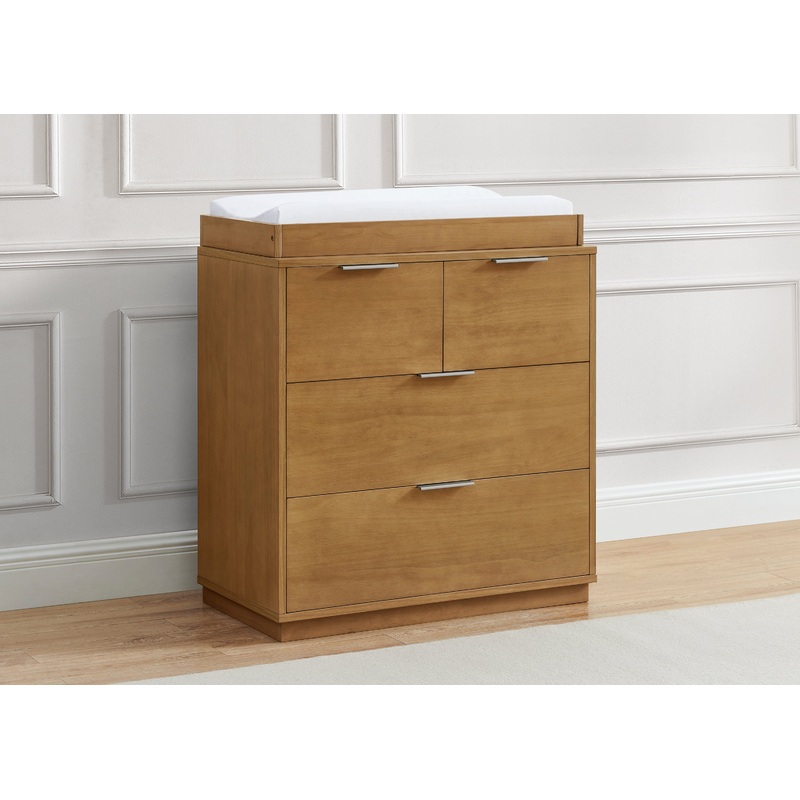 With clean lines and sleek platform base, the Forever 4 Drawer Dresser with Changing Top by Delta Children is a timeless design that’s totally at home in the modern nursery or kid’s room. With four spacious drawers, a richly textured finish thats hand applied and included changing top, this dresser is everything you need for your childs space (changing pad sold separately). When your child grows, just remove the topper, and it easily transitions into a stand-alone dresser. Constructed from made-to-last sustainable materials to ensure stability and longevity, this dresser is also GREENGUARD Gold Certified, which means its built to contribute to cleaner air for a healthy home. For your childs safety, this dresser is outfitted with an interlocking drawer system that limits the number of drawers that can be opened at one time.This dresser is tested to meet the current requirements of ASTM F2057, the mandatory CPSC safety standard that protects young children from furniture tip-over incidents. For your childrens safety, only purchase dressers that comply with this standard. For additional security, Delta strongly recommends that all dressers in your home be anchored; all Delta dressers include a wall anchor. To learn how to properly secure your dresser, please see the product assembly instructions or visit our website.