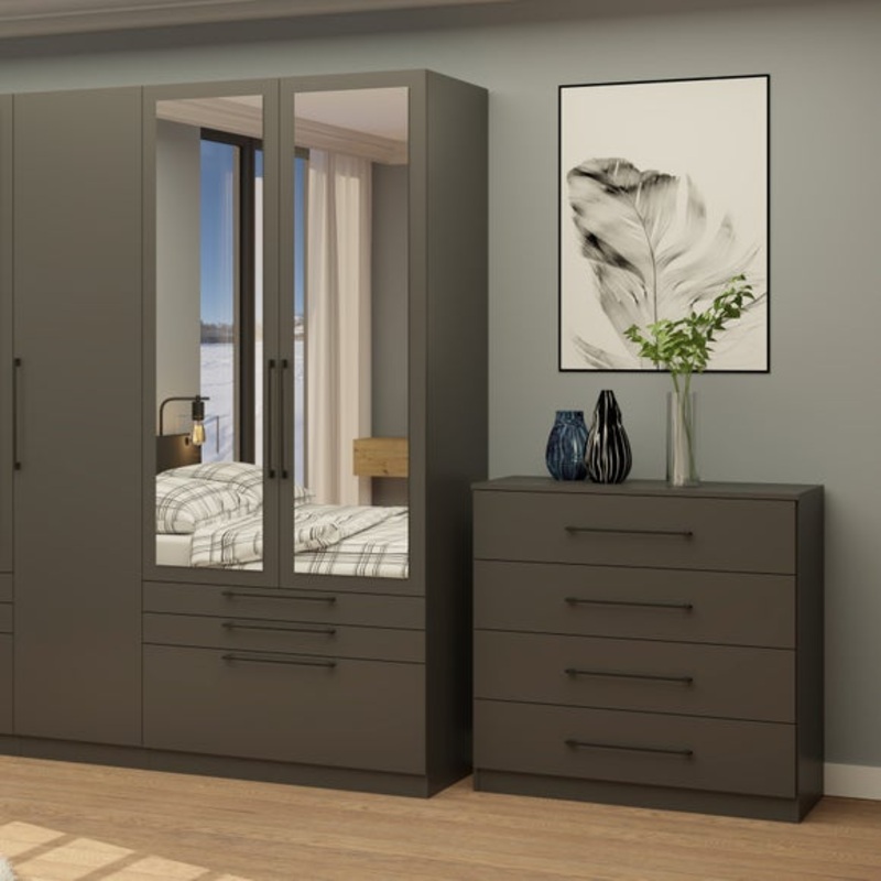 Spacious, extra-large wardrobeAdjustable shelves and hanging rails6 soft-close drawersOptions for no mirrors/mirrored doorsChoice of oak effect or dark grey anthracite colourwaysSleek, modern bar handlesThe ultimate storage solution for busy lives - the Fo