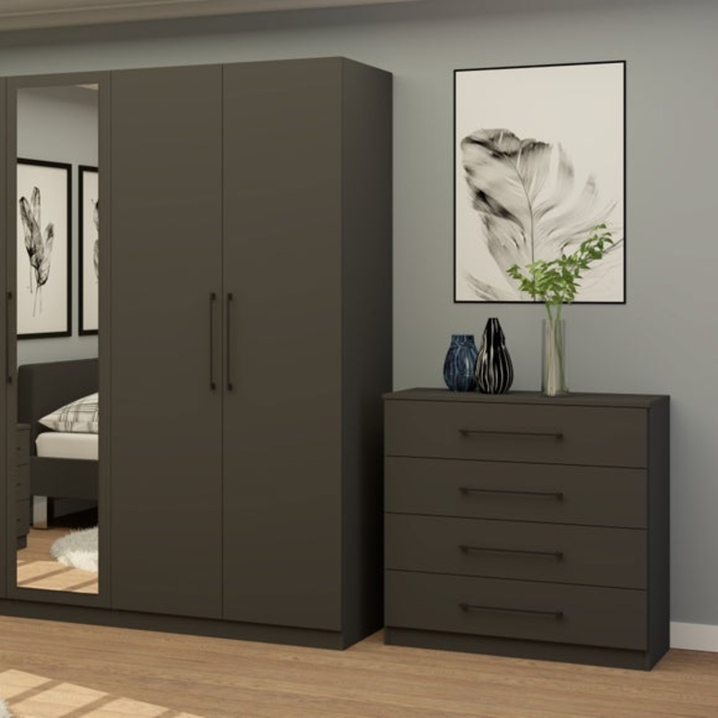 Extra-large, spacious wardrobeOptions for no mirror/mirroredAvailable in oak effect or dark grey anthraciteSleek metal bar handlesAdjustable shelves and hanging railsSpacious storage and contemporary style - the Foster 5 door wardrobe is an extra-large sto