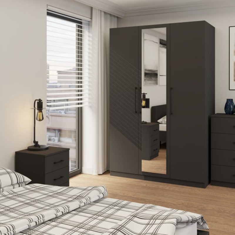 Spacious triple wardrobeModern metal bar handlesOptions for no mirror/mirroredAvailable in anthracite grey or oak effect colourwaysAdjustable shelves and hanging railsEffective and flexible storage has just become a whole lot simpler to achieve with the Fo