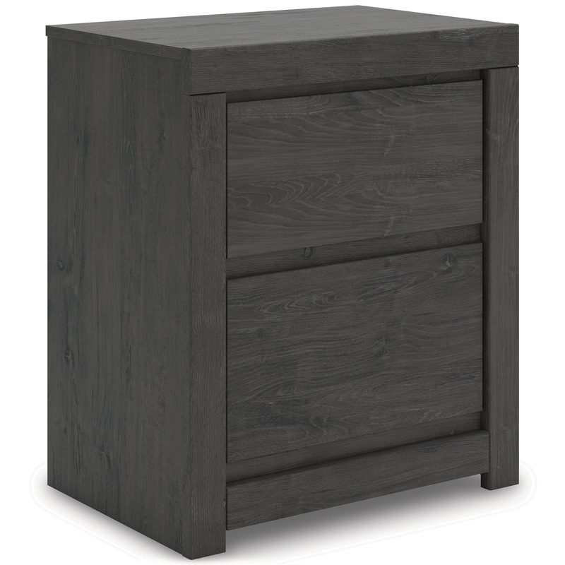 Find serene simplicity in the clean lines and dark neutral tones of this nightstand. Its a sincere approach to modern elegance, giving you high style at a great value. A sleek hardware-less design creates a fuss-free look. Winding down before bed? Keep essentials close with the nightstands smooth-gliding drawers and USB charging.