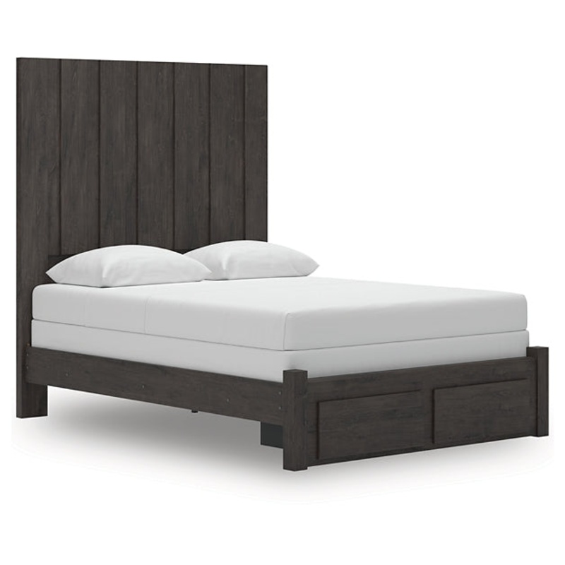 Find serene simplicity in the clean lines and dark neutral tones of this queen panel storage bed. Its a sincere approach to modern elegance, giving you high style at a great value. Short on storage? Smooth-gliding drawers in the footboard keep clutter neatly tucked away. Vertical planks decorate the generously scaled headboard to give the illusion of additional height, polishing off the piece in grand fashion.