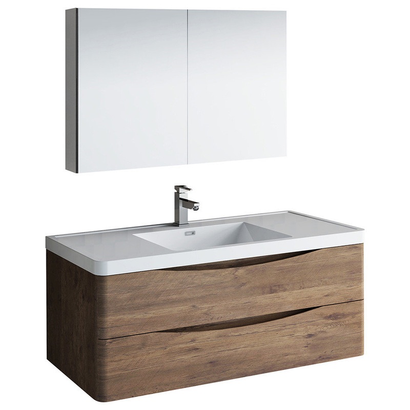 With its stylish Rosewood finish, the Fresca Tuscany Wall Hung Modern Bathroom Vanity adds a contemporary touch to any bathroom. The cabinet offers great storage with soft-closing drawers, just perfect for organizing all of your daily essentials. The drawers feature integrated handles that beautifully complement the minimalist look. Gracing the top of the cabinet is an eye-catching white acrylic-resin countertop/sink with a unique rimmed edge and integrated overflow. The sink has been pre-drilled to accommodate a single hole faucet (included). The set also includes p-trap, pop-up drain and installation hardware. This ensemble comes with a fully mirrored medicine cabinet with two adjustable glass shelves, to complete the look. This chic vanity ensemble is available in multiple colors and makes a stylish statement in any home.