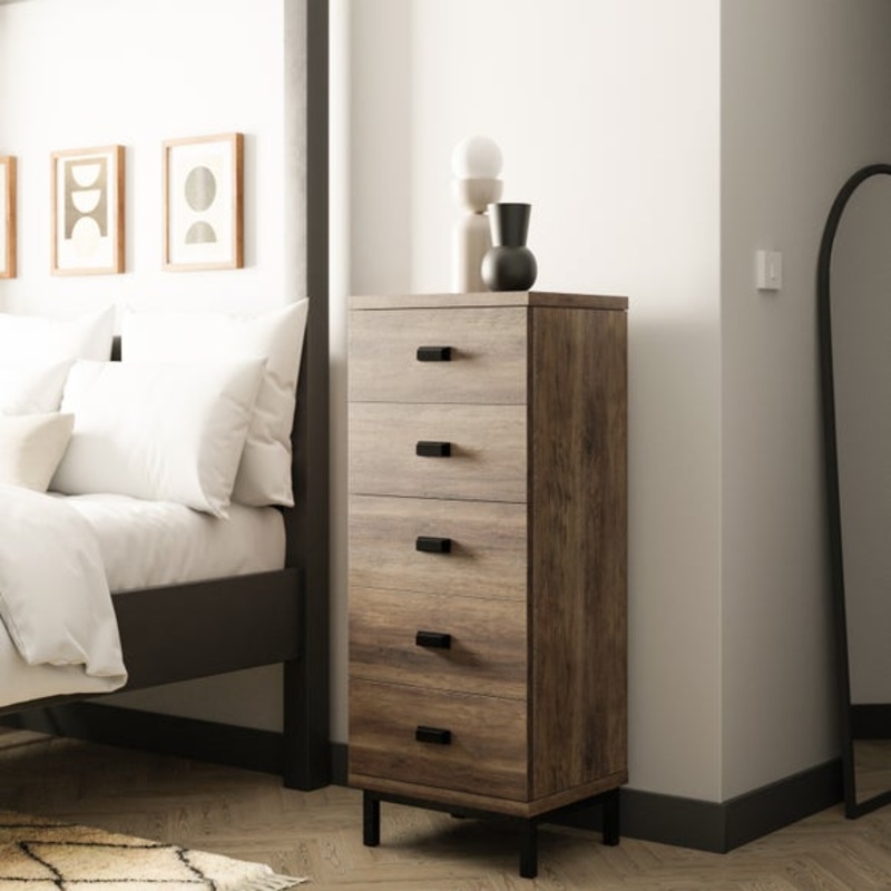 Dunelm Exclusive - Designed and Developed by DunelmStylish tall chestAmple storage - 5 drawersBlack metal handlesIndustrial inspired designThe stylish Fulton Tall Chest has a trendy industrial design with black metal handles and pine effect finish. Providi