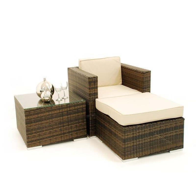 Ideal for a small patio, this neat set features a corner arrangement, however, it can also be utilised in a number of social combinations. This set consists of a 1 Armchairs, Ottoman and a Coffee Table.