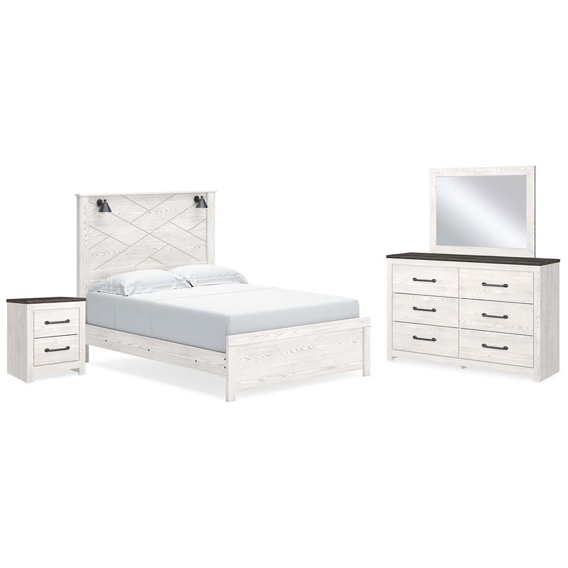 Cool, clean and casually modern. This bedroom packages wispy whitewash and gray finish sets the tone for your calming sanctuary. Large linear drawer pulls add dimension and authenticity, while the abstract headboard design brings a fresh look to the set.