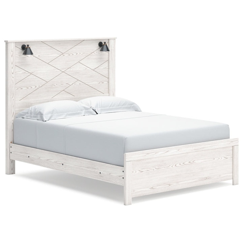 Cool, clean and casually modern. This queen panel beds white rustic finish sets the tone for your calming sanctuary. Matte black sconce lights and an abstract design on the headboard bring a fresh look to the beds simply stunning profile.Includes queen pan