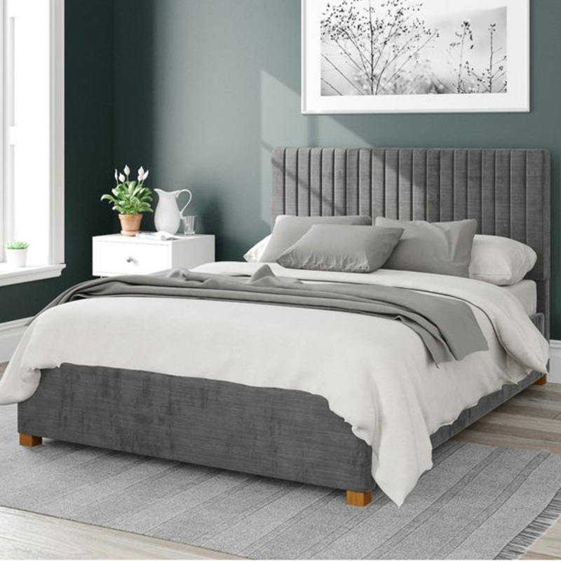 Velour fabric ottoman bedVertical line headboard designContemporary Grant rangeHand upholstered with deep paddingLarge storage area with fabric dust protection sheetHands free access to storage (mattresses up to 60kg) - mattress not includedSolid hardwood