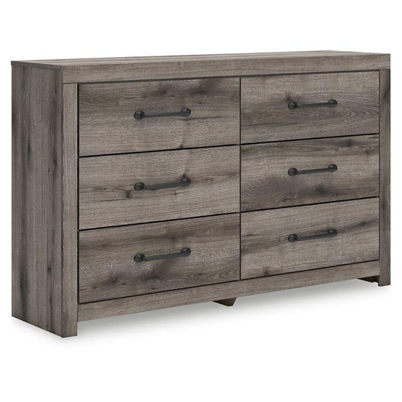 Combining a casual aesthetic with functional flair, this dresser suits styles from rustic to industrial. Its smooth-gliding drawers store everyday essentials with ease, from clothes to bed linens. Elongated drawer pulls in a dark hue polish off the look, harmonizing beautifully with the weathered gray wood grain.
