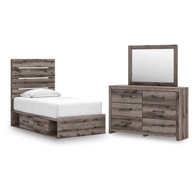 | Details | PCB2405B18: Includes panel headboard/footboard, rails with side storage and roll slats, Made with engineered wood (MDF/particleboard/plywood) and decorative laminate for the right balance of affordability and durability , Weathered gray finish over replicated oak grain, Decorative laminate replicates natural or man-made material surfaces with consistent color, pattern and texture, 2 smooth-gliding drawers, 2 storage cubbies, Bed does not require additional foundation/box spring; accommodates most zero clearance adjustable bases with the addition of a bunkie board, Mattress available, sold separately, Minor assembly required, PCB2405B1: Includes dresser and mirror, Made with engineered wood (MDF/particleboard/plywood) and decorative laminate for the right balance of affordability and durability , Weathered gray finish over replicated oak grain, Decorative laminate replicates natural or man-made material surfaces with consistent color, pattern and texture, Large-scale dark colored handles, 6 smooth-gliding drawers, Drawer interiors are lined with a faux linen laminate for a clean, finished look , Safety is a top priority, clothing storage units are designed to meet the most current standard for stability, ASTM F 2057 (ASTM International), Drawers extend out to accommodate maximum access to drawer interior while maintaining safety, Mirror attaches to back of dresser; can also be mounted on wall horizontally or vertically , Minor assembly required, |