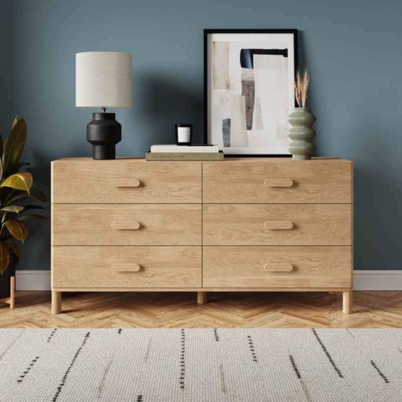Wide chest of drawers6 drawers for storageLight oak effect finishRetro inspired stylePart of the Hatton range, this wide chest of drawers is perfect for all your storage needs. With 6 roomy drawers, your items can all be stored neatly away, whilst the top