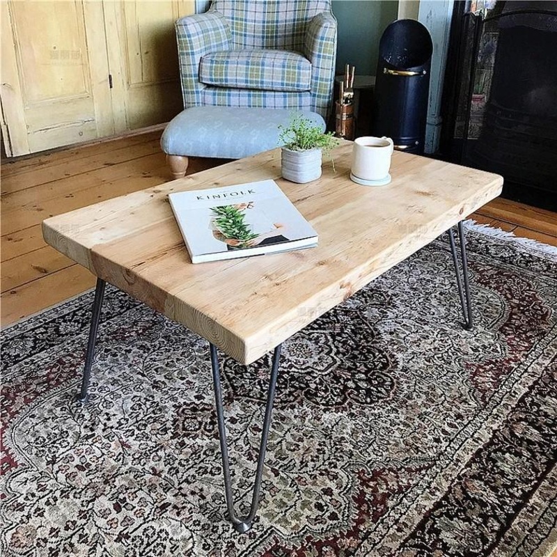 Raw bookmatched oak wood slabsform this simple yetelegant coffee table design, supported by steel hairpin legs. Perfect for industrial or rustic interior themes with its clean cut lines and minimalist design.Dimensions (cm): 80L x 50W x 45H 100L x 60W x 45