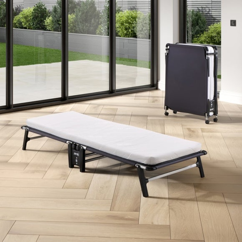Folding bed frame and mattress360 degree castorsAnti-tipThe Jay-Be Hideaway Folding Bed is a versatile and space-saving solution for guests, sleepovers, or glamping adventures. It features a comfortable e-Fibre mattress for a restful sleep and J-Grip anti-