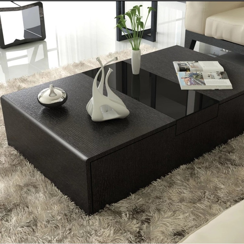 A beautiful coffee table acts as a centerpiece and offers room for meals, work, and treats during social gatherings.The Jedson is simple and stylish with its matte black or white laminate surface, and a strip of glossy tempered glass down its middle.The table surface parts to reveal storage space formedia accessories, DVDs, and books.