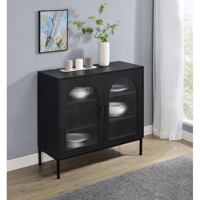 Enhance your dining or living space with this sleek black sideboard, elegantly shaped with subtle arches and showcasing framed fluted tempered glass doors. Inside, adjustable shelves provide flexible storage for dinnerware and dcor, while its minimalist profile rests on slender metal legs for a refined touch. Constructed from engineered wood and laminate veneer, this versatile piece blends durability, easy maintenance, and understated style, seamlessly complementing modern interiors.