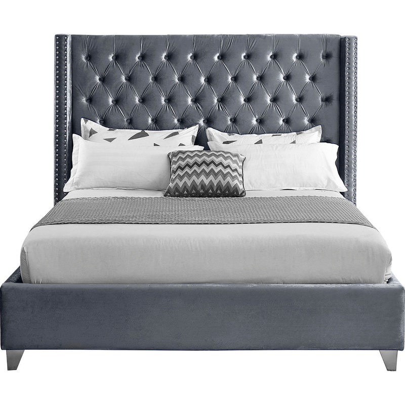 Elegant and eye-catching, the stunning Aiden Bed from Meridian Furniture is the perfect addition to any bedroom. Rich velvet covers the deep tufted design. A beautiful wing bed design is complimented by hand applied chrome nail head details. Strength and beauty is guaranteed with a solid wood frame and stainless steel legs. Everly Quinn Size: King, Color: Gray, Nailhead Finish: Chrome