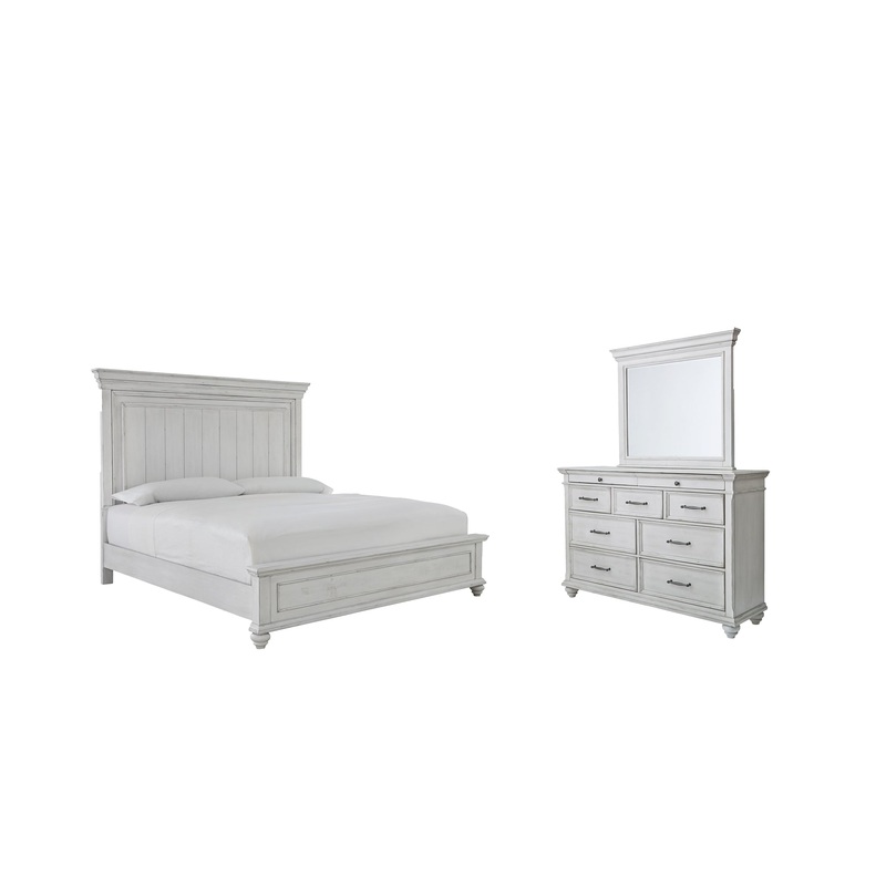 Details B777B1: Includes dresser and mirror, Made with solid wood, veneers and engineered wood, Distressed whitewash finish, Dark gray pewter-tone finished metal hardware, 7 smooth-gliding drawers, plus 2 small-scaled accessory drawers, Mirror attaches to back of dresser, Assembly required, B777B2: Includes queen panel headboard, footboard and rails, Made with solid wood, veneers and engineered wood, Distressed whitewash finish, Foundation/box spring required, sold separately, Mattress available, sold separately, Assembly required,