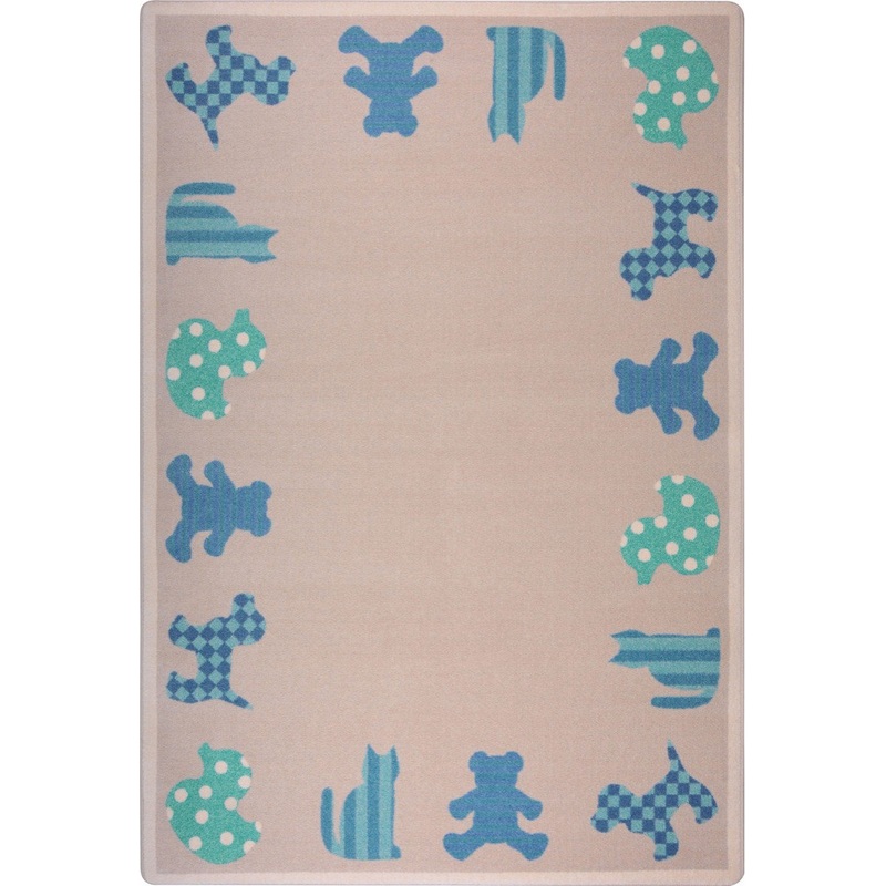 Dots, diamonds, and stripes decorate the cookie-cutter shapes of baby animals scattered across this earth-tone carpet. As children grow, they will learn the names and sounds each animal makes. An adorable carpet for the youngest member of the family!