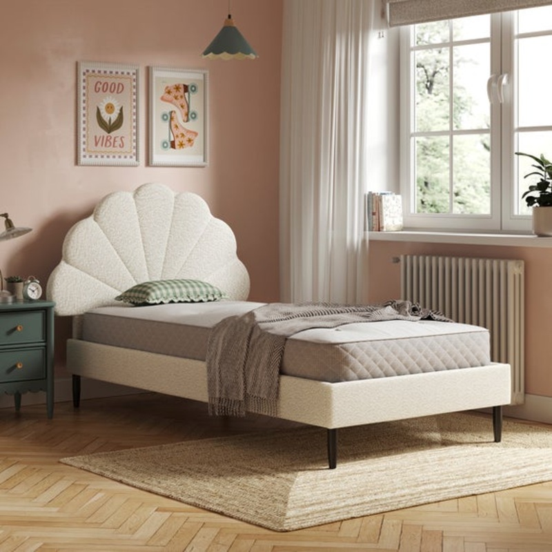 Upholstered children's bedSoft boucle fabricPetal detailingSoft, stylish, and oh-so-snuggly, this bed is a dream come true for little sleepyheads. Wrapped in a beautifully textured boucl, it brings a cosy, calming vibe to any bedroom. The plush upholstery
