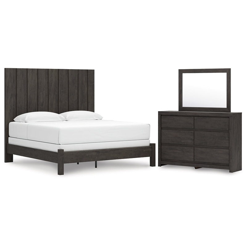 Details PCB3370B8: Includes headboard panel, headboard posts, footboard and rails, Made with engineered wood (MDF/particleboard/plywood) and decorative laminate for the right balance of affordability and durability , Dark charcoal finish over replicated oak grain, Decorative laminate replicates natural or man-made material surfaces with consistent color, pattern and texture, Foundation/box spring required, sold separately, Mattress available, sold separately, Assembly required, PCB3370B1: Includes dresser and mirror, Made with engineered wood (MDF/particleboard/plywood) and decorative laminate for the right balance of affordability and durability , Dark charcoal finish over replicated oak grain, Decorative laminate replicates natural or man-made material surfaces with consistent color, pattern and texture, Recessed hand grabs create hardware-less effect, 6 smooth-gliding drawers, Drawer interiors are lined with a faux linen laminate for a clean, finished look , Safety is a top priority, clothing storage units are designed to meet the most current standard for stability, ASTM F 2057 (ASTM International), Drawers extend out to accommodate maximum access to drawer interior while maintaining safety, Mirror attaches to back of dresser; can also be mounted on wall horizontally or vertically, Assembly required,
