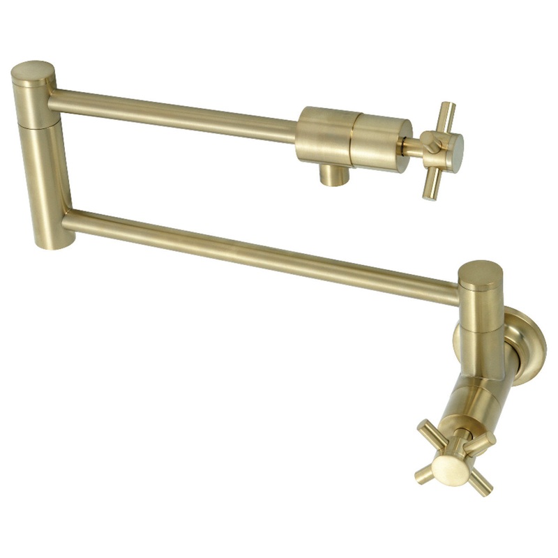 This faucet boasts bold, sleek design with its cylindrical styling. As an excellent tool to quickly, easily, and stylishly fill pots, eliminate strain on your joints. Pot-fillers are useful gadgets placed directly above the stove, providing easily accessible water. The foldable swing arms of this pot filler allow for extendable reach of up to 21.5-inch of length and provide long-lasting function due to their sturdy brass construction. Additionally, the dual handles prevent unwanted water spillage while enhancing the modern theme.