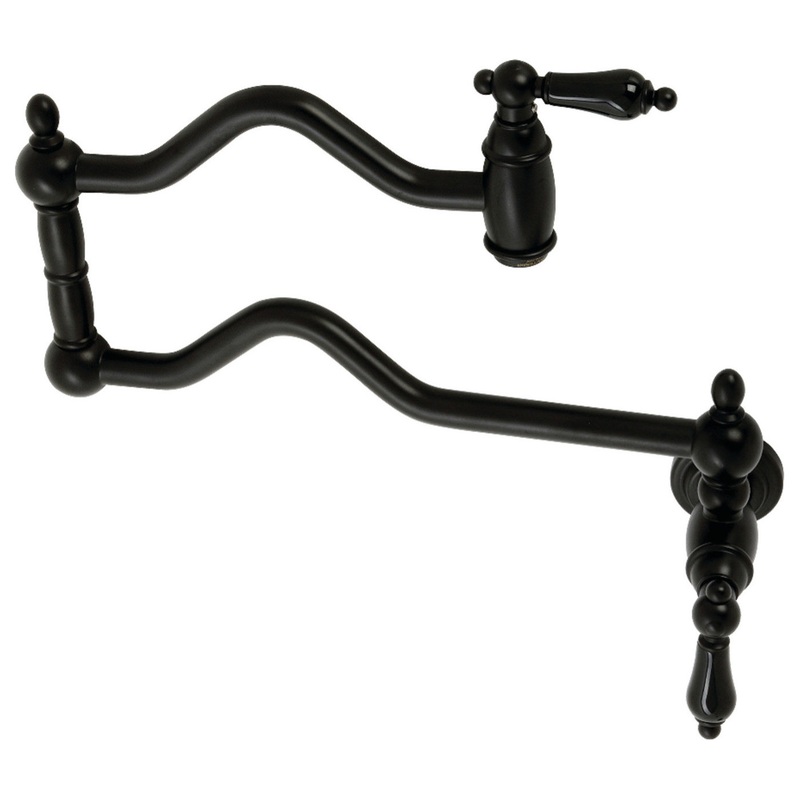 Crafted in commendations to English nobility, the exemplary design of this faucet manifests regality and elegance with its black porcelain handles. As an excellent tool to quickly, easily, and stylishly fill pots, eliminate strain on your joints. Pot-fillers are useful gadgets placed directly above the stove, providing easily accessible water. The foldable swing arms of this pot filler allow for extendable reach of up to 22-inch of length and provide long-lasting function due to their sturdy brass construction. Additionally, the dual handles prevent unwanted water spillage while enhancing the traditional theme.