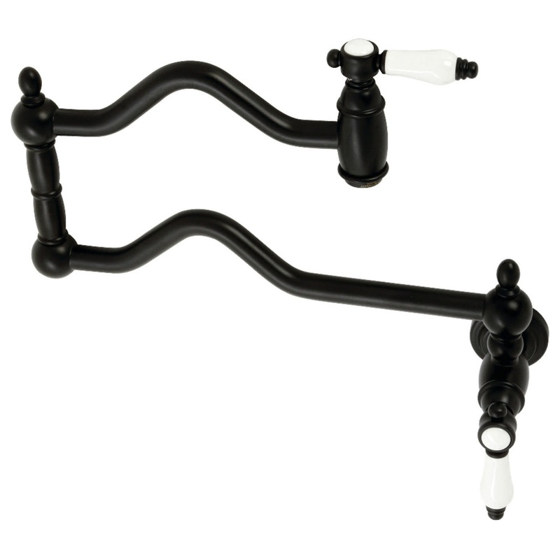 The graceful elegance of a timeless design is beautifully merged between British flair and Victorian delicacy within this faucet’s white porcelain levers. As an excellent tool to quickly, easily, and stylishly fill pots, eliminate strain on your joints. Pot-fillers are useful gadgets placed directly above the stove, providing easily accessible water. The foldable swing arms of this pot filler allow for an extendable reach of up to 22″ of length and provide long-lasting function due to their sturdy brass construction. Additionally, the dual handles prevent unwanted water spillage while enhancing the traditional theme. Kingston Brass KS210.BPL Features: Covered under Kingston Brass’ 10-year limited warranty Constructed of brass Coordinates with products from the Bel-Air line seamlessly Dual lever handles ADA compliant Kingston Brass KS210.BPL Specifications: Height: 12-1/16″ Width: 24-1/8″ Faucet Hole: Single Faucet Hole Size: 1-3/8″ Spout Reach: 22″ Flow Rate: 3.8 gallons per minute Connection Size: 1/2″