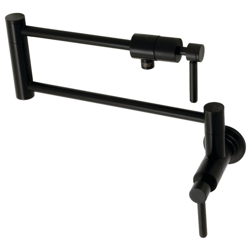 This faucet boasts a bold, sleek design with its cylindrical styling. As an excellent tool to quickly, easily, and stylishly fill pots, eliminate strain on your joints. Pot-fillers are useful gadgets placed directly above the stove, providing easily accessible water. The foldable swing arms of this pot filler allow for an extendable reach of up to 21-1/2″ of length and provide long-lasting function due to their sturdy brass construction. Additionally, the dual handles prevent unwanted water spillage while enhancing the modern theme. Kingston Brass KS410.DL Features: Covered under Kingston Brass’ 10-year limited warranty Constructed of brass Coordinates with products from the Concord line seamlessly Dual lever handles ADA compliant Kingston Brass KS410.DL Specifications: Height: 12-7/8″ Width: 23-1/2″ Faucet Hole: Single Faucet Hole Size: 1-3/8″ Spout Reach: 21-1/2″ Flow Rate: 3.8 gallons per minute Connection Size: 1/2″