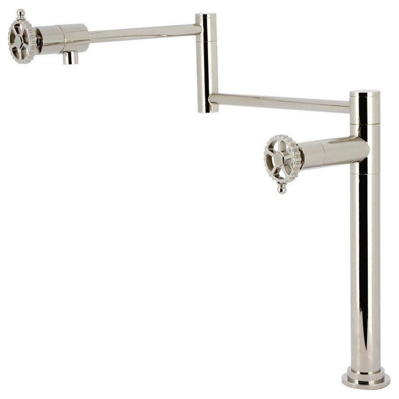 Upgrade your kitchen with our sleek deck mount pot filler faucet featuring foldable swing arms for an extendable reach of up to 21-11/16". Crafted with durable brass construction, this pot filler ensures reliable and effortless pot-filling while minimizing