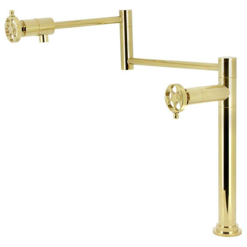 Upgrade your kitchen with our sleek deck mount pot filler faucet featuring foldable swing arms for an extendable reach of up to 21-11/16″. Crafted with durable brass construction, this pot filler ensures reliable and effortless pot-filling while minimizing joint strain. Say goodbye to carrying heavy water to and from the sink and enjoy convenient pot-filling directly above your stove. Experience the perfect blend of style, convenience, and functionality with our deck mount pot filler, transforming your culinary space. Kingston Brass KS470.RKZ Features: Covered under Kingston Brass’s 10 year limited warranty Faucet body constructed of brass Single hole mounting type Deck mounted faucet installs directly to sink or countertop Swivel spout rotates 180 degrees which allows for greater access to all areas of the sink Double wheel handles control the flow of water Includes ceramic disc cartridge Low lead compliant Kingston Brass KS470.RKZ Specifications: Height: 18-1/16″ (deck to top of faucet) Spout Reach: 22-11/16″ (center of faucet body to center of spout outlet) Flow Rate: 3 gallons-per-minute Faucet Holes: Single Hole Faucet Hole Size: 1-1/2″
