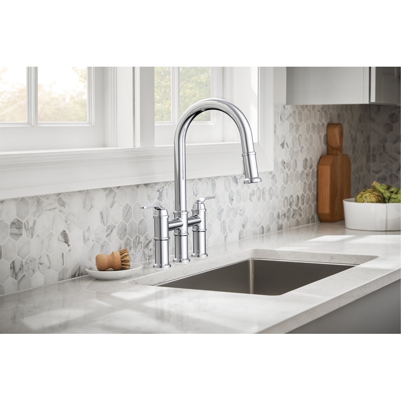 A blend of traditional form with modern functionality, the Kinzie Two Handle Bridge Pull-Down Faucet is the best of both worlds. Its sophisticated style coupled with distinct industrial details, brings a sense of urban loft living to any kitchen, while als
