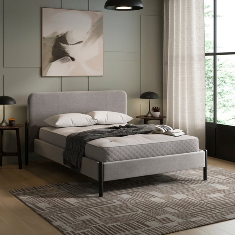 Modern bed frameSoft chenille upholsteryWooden accentsSink into sophistication with this chenille beauty, where comfort meets contemporary charm. Upholstered in irresistibly soft, high-quality chenille, its the kind of bed that makes you want to dive strai