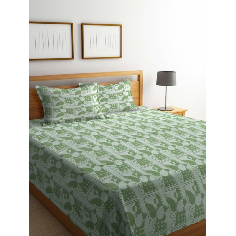 GR4670177750Klotthe Woven Green 350 TC Cotton Double Bed Cover With 2 Pillow Covers