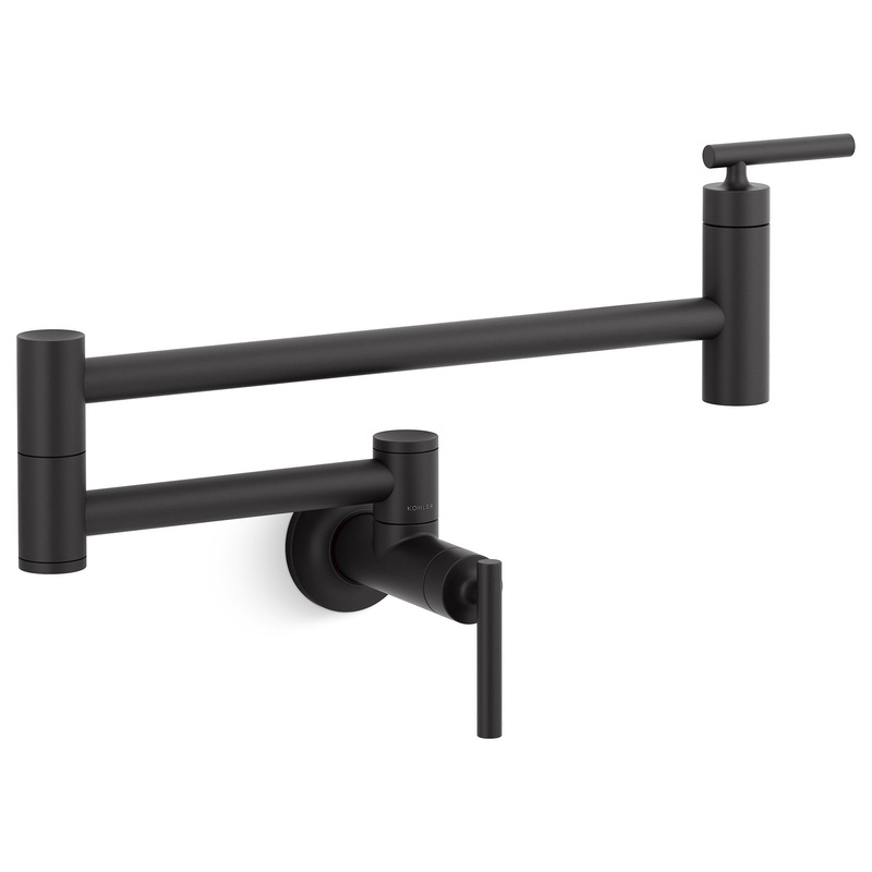 Imagine the practicality of a faucet that takes up no valuable counter space and can fold out of the way when not in use. Now imagine a faucet that can swing both to the left or right, extends to over 23 so that you can fill pots on or near your stove, and fills faster thanks to its robust 5.2 gpm flow rate. The wall-mount pot filler from KOHLER, with its clean, contemporary design, doesnt overpower or detract from your kitchen design, but it will still create a stir. Kohler K-35745 Features: Covered under Kohler’s limited lifetime warranty Faucet body constructed of metal Single hole mounting type Wall mounted faucet installs on the wall directly above sink Swivel spout allows for greater access to all areas of the sink Single lever handle controls the flow and temperature of water Includes ceramic disc cartridge Kohler K-35745 Specifications: Height: 9-5/8″ Spout Reach: 23-1/4″ (center of faucet body to center of spout outlet) Flow Rate: 5.2 gallons-per-minute Faucet Holes: Single Hole