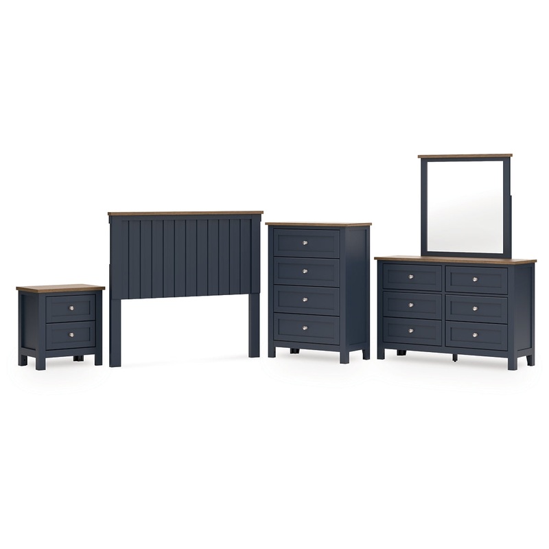 Details B414-87: Made with hardwood solids, mindi wood veneer and MDF substrates, Two-tone finish features a dark slate blue with a light brown wood-tone top, ” bolts (not included) are needed to attach headboard to your existing bed frame, Assembly required, B414B1: Includes dresser and mirror, Made with hardwood solids, mindi wood veneer and MDF substrates, Two-tone finish features a dark slate blue with light brown wood-tone top, Nickel-tone metal knobs, 6 drawers with fully finished interior, dovetail construction and heavy duty ball-bearing side glides, Mirror attaches to back of dresser, B414-45: Made with hardwood solids, mindi wood veneer and MDF substrates, Two-tone finish features a dark slate blue with a light brown wood-tone top, Nickel-tone metal knobs, 4 drawers with fully finished interior, dovetail construction and heavy duty ball-bearing side glides, B414-92: Made with hardwood solids, mindi wood veneer and MDF substrates, Two-tone finish features a dark slate blue with a light brown wood-tone top, Nickel-tone metal knobs, 2 drawers with fully finished interior, dovetail construction and heavy duty ball-bearing side glides,